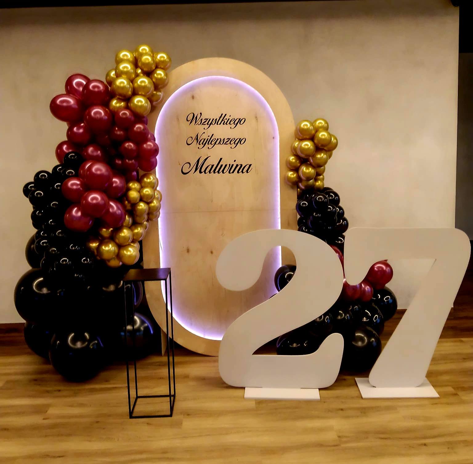 Oferuję wypożyczenie ścianki dekoracyjnej z pełną dekoracją oraz napisem personalizowanym – dokładnie jak na zdjęciu.