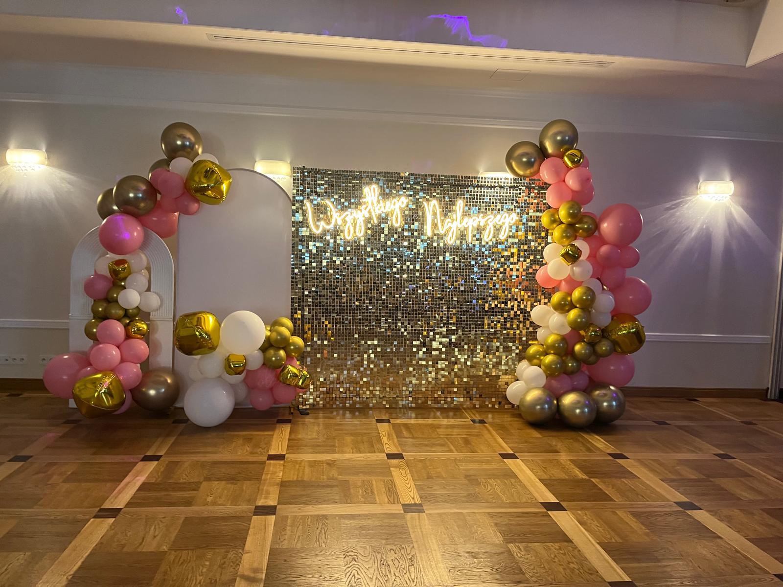Na przyjęciu 18. urodzinowym fotobudka 360 może stać się centralnym punktem wizualnym całej imprezy. W jednej z realizacji tłem dla nagrań była złota ścianka z połyskujących cekinów, tworząca elegancki i glamour klimat. Obok niej ustawiono kompozycję balonową w odcieniach złota, bieli i pudrowego różu – kolorystyce doskonale pasującej do urodzinowej estetyki. Takie połączenie sprawia, że każde nagranie wygląda jak ujęcie z planu teledysku lub modowej sesji zdjęciowej.